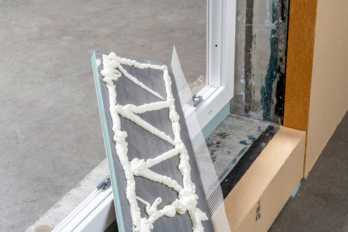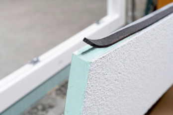Assembly is first carried out at the top in the fall area (if no sunshading is built in), the panel is integrated continuously here. The other reveal sides are then butt-jointed or assembled with a mitre cut. The reveal panels should be fixed until the adhesive cures. In the boundary area to the roller shutter box and the insulation wedge, the joints must be sealed with adhesive or stone and façade sealant. Any cavities in the angle joints of the reveal panels must also be filled with stone and façade sealant.